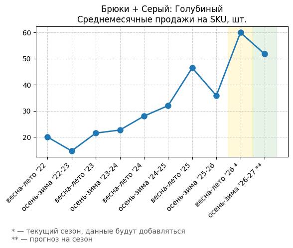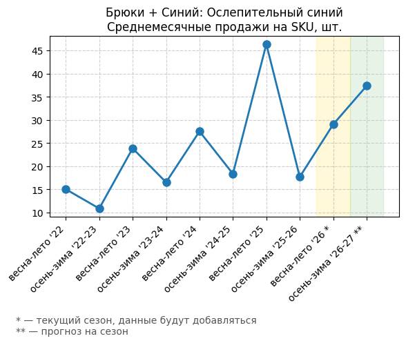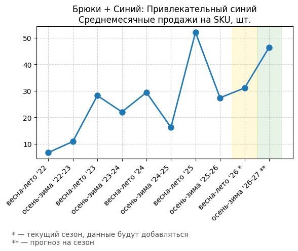 Брюки + Синий: Привлекательный синий - Среднемесячные продажи на SKU, шт.