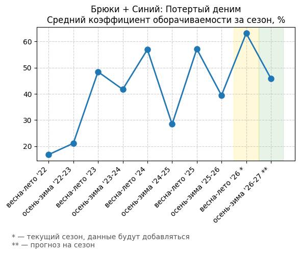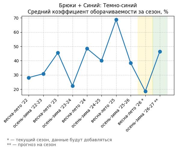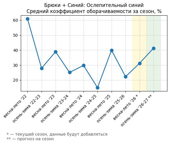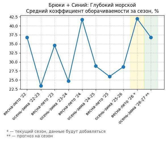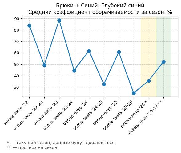 Брюки + Синий: Глубокий синий - Средний коэффициент оборачиваемости за сезон, %