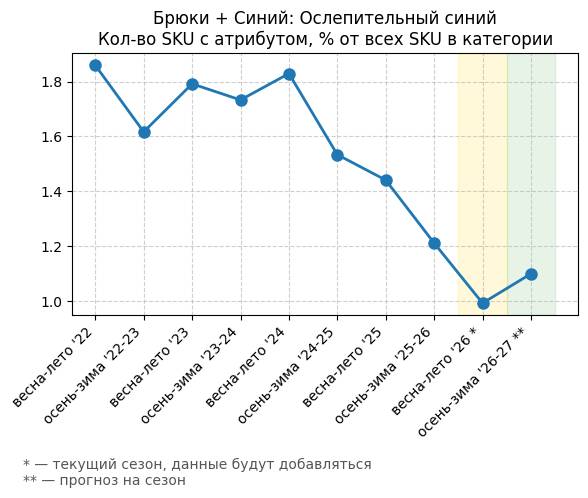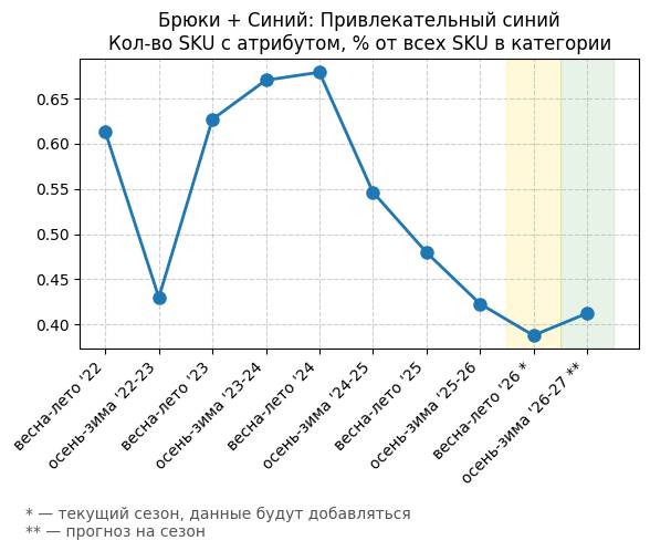 Брюки + Синий: Привлекательный синий - Кол-во SKU с атрибутом, % от всех SKU в категории