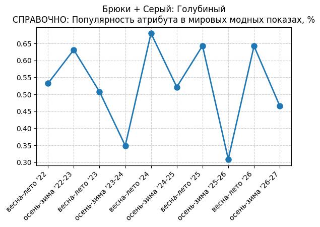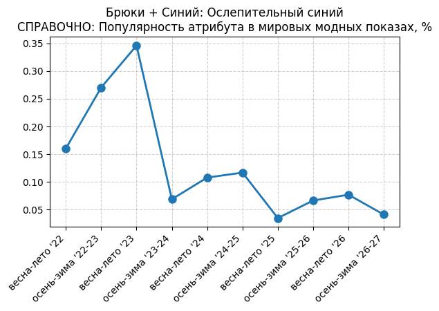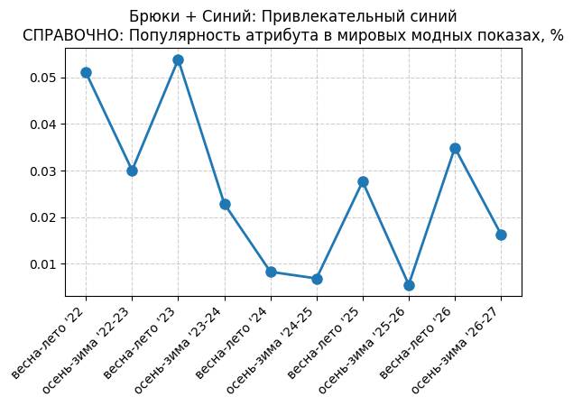 Брюки + Синий: Привлекательный синий - СПРАВОЧНО: Популярность атрибута в мировых модных показах, %