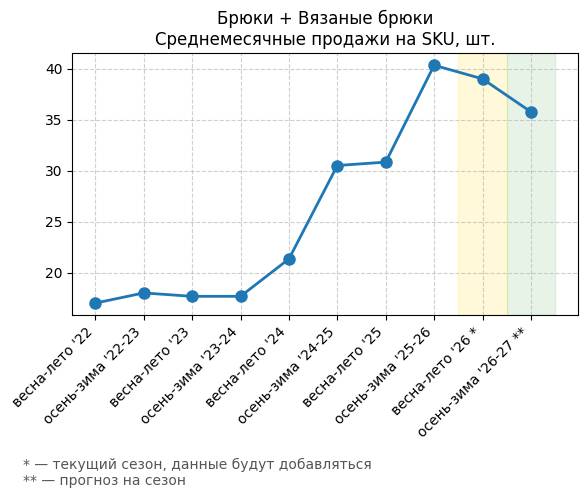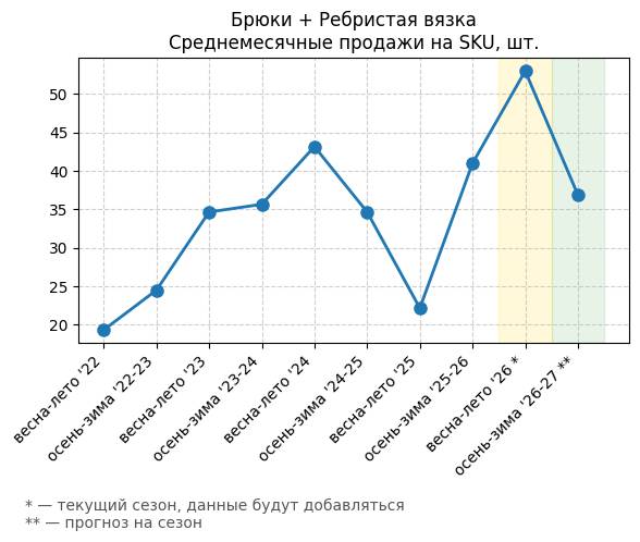 Брюки + Ребристая вязка - Среднемесячные продажи на SKU, шт.