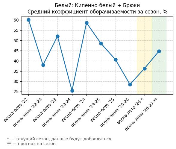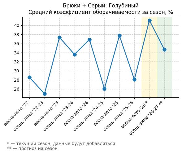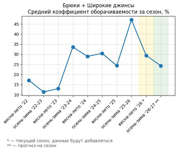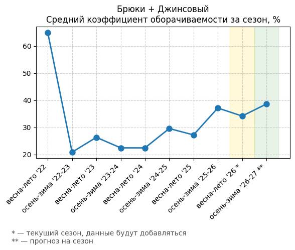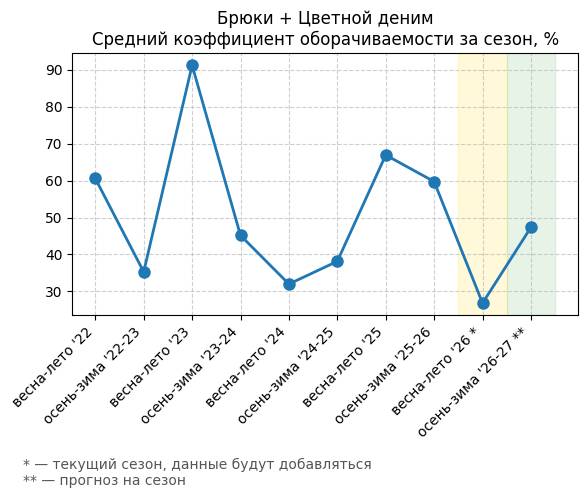 Брюки + Цветной деним - Средний коэффициент оборачиваемости за сезон, %