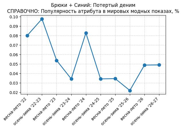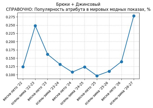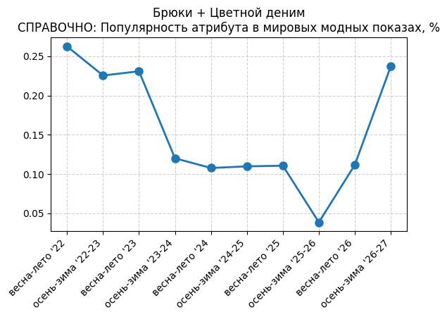 Брюки + Цветной деним - СПРАВОЧНО: Популярность атрибута в мировых модных показах, %