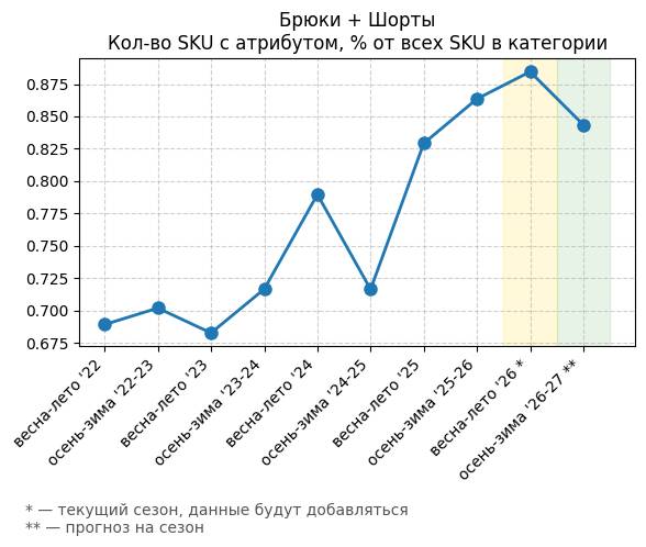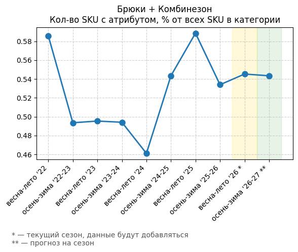 Брюки + Комбинезон - Кол-во SKU с атрибутом, % от всех SKU в категории