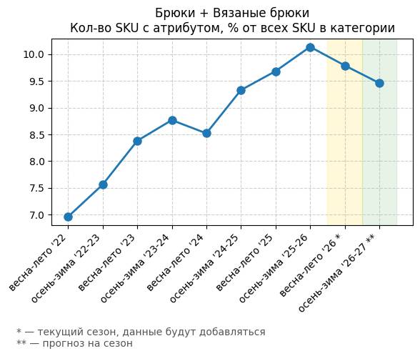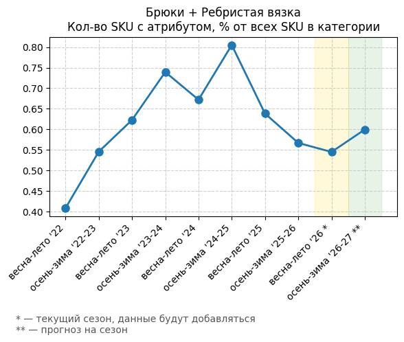 Брюки + Ребристая вязка - Кол-во SKU с атрибутом, % от всех SKU в категории
