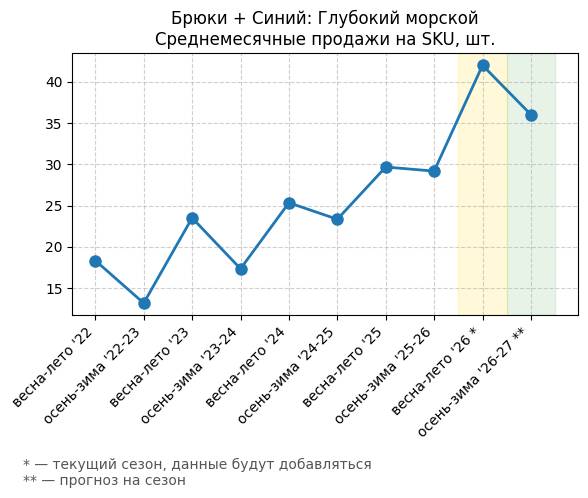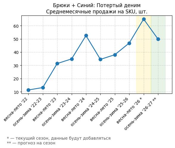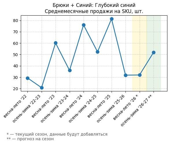 Брюки + Синий: Глубокий синий - Среднемесячные продажи на SKU, шт.