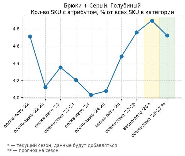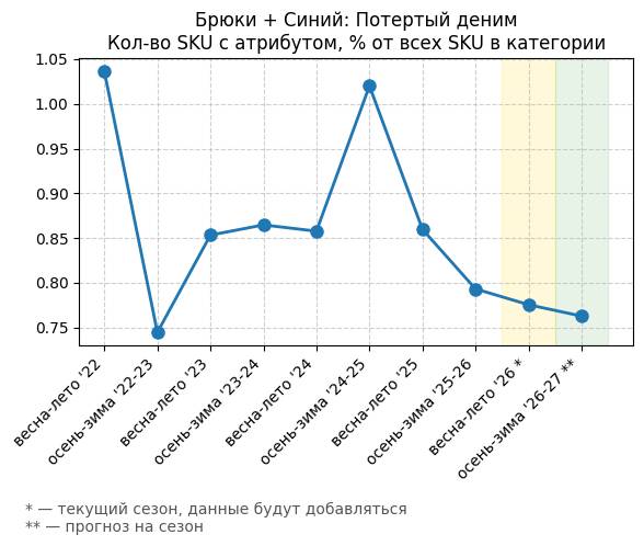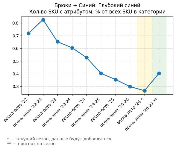 Брюки + Синий: Глубокий синий - Кол-во SKU с атрибутом, % от всех SKU в категории