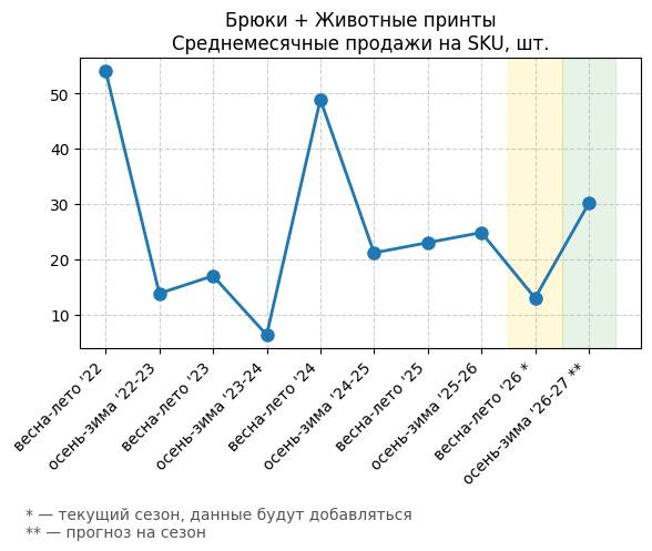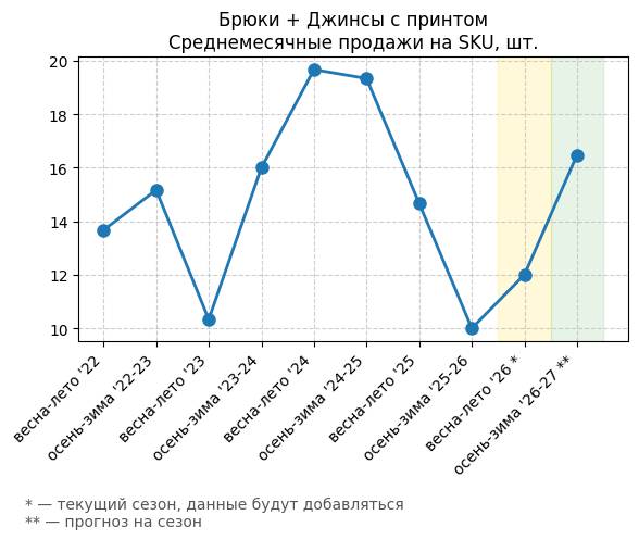 Брюки + Джинсы с принтом - Среднемесячные продажи на SKU, шт.