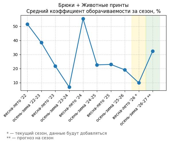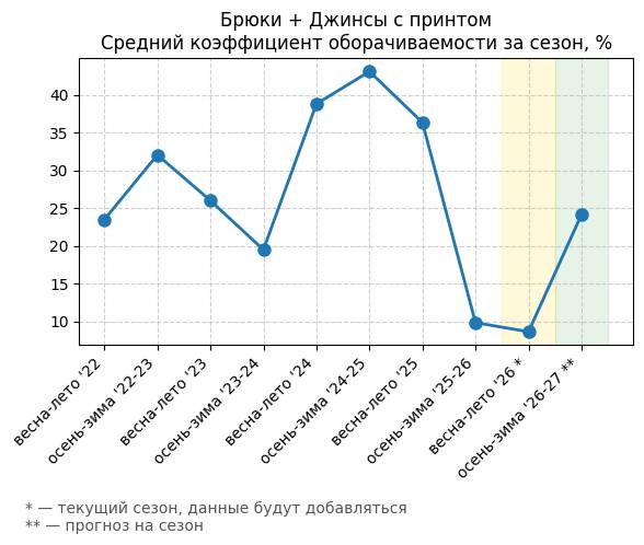 Брюки + Джинсы с принтом - Средний коэффициент оборачиваемости за сезон, %