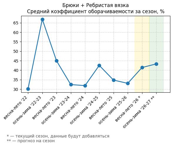 Брюки + Ребристая вязка - Средний коэффициент оборачиваемости за сезон, %