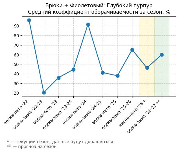 Брюки + Фиолетовый: Глубокий пурпур - Средний коэффициент оборачиваемости за сезон, %