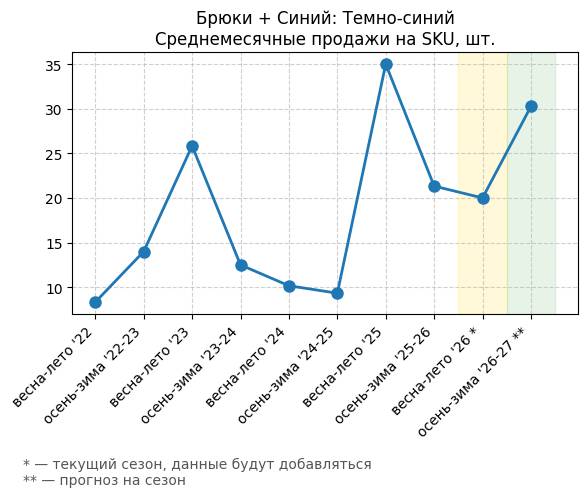 Брюки + Синий: Темно-синий - Среднемесячные продажи на SKU, шт.