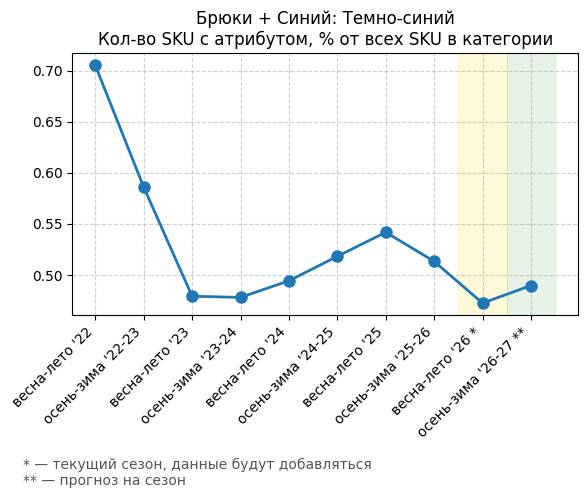 Брюки + Синий: Темно-синий - Кол-во SKU с атрибутом, % от всех SKU в категории