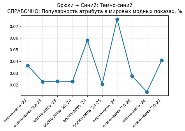 Брюки + Синий: Темно-синий - СПРАВОЧНО: Популярность атрибута в мировых модных показах, %