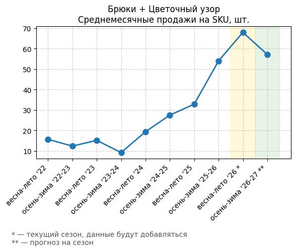 Брюки + Цветочный узор - Среднемесячные продажи на SKU, шт.