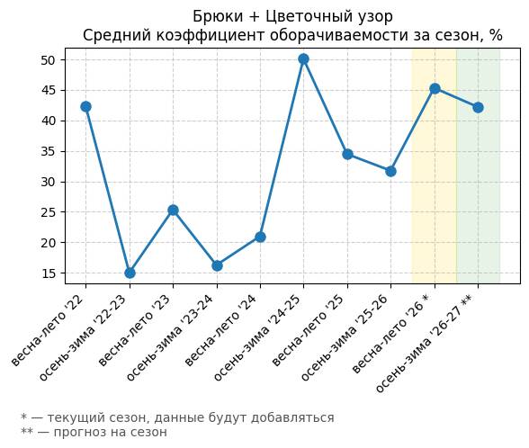 Брюки + Цветочный узор - Средний коэффициент оборачиваемости за сезон, %