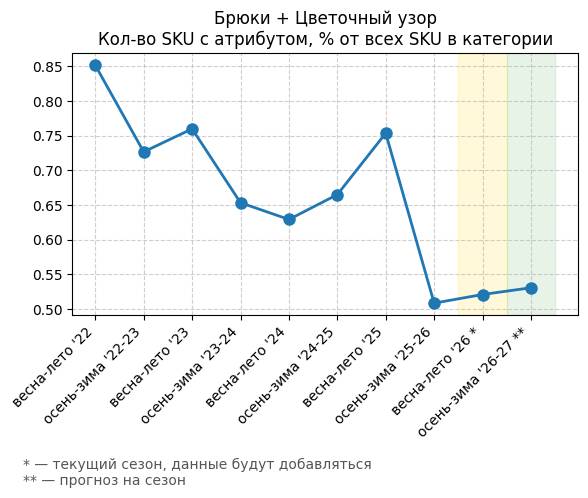 Брюки + Цветочный узор - Кол-во SKU с атрибутом, % от всех SKU в категории