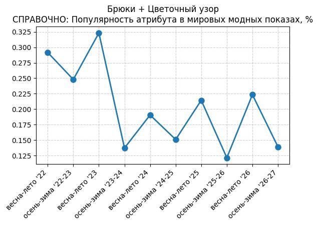 Брюки + Цветочный узор - СПРАВОЧНО: Популярность атрибута в мировых модных показах, %