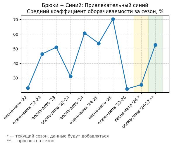Брюки + Синий: Привлекательный синий - Средний коэффициент оборачиваемости за сезон, %