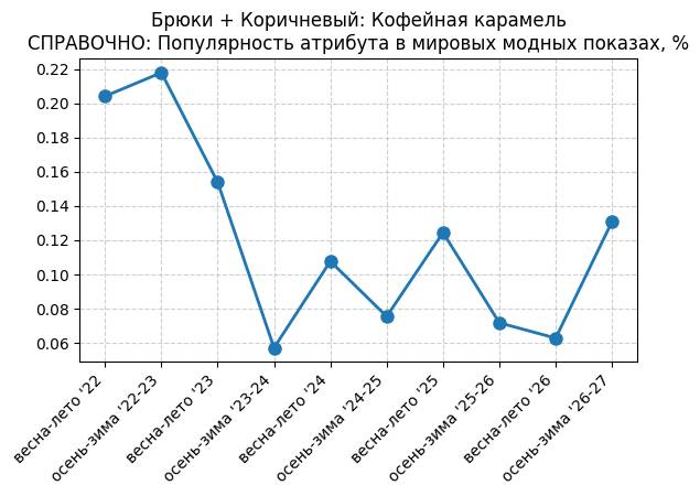 Брюки + Коричневый: Кофейная карамель - СПРАВОЧНО: Популярность атрибута в мировых модных показах, %