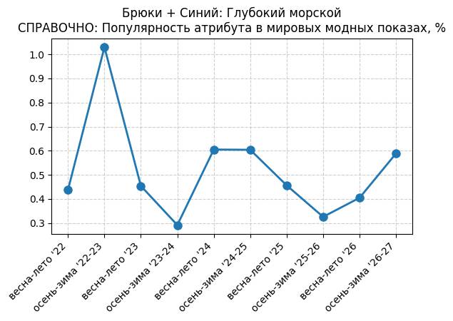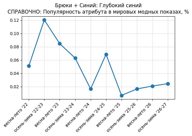 Брюки + Синий: Глубокий синий - СПРАВОЧНО: Популярность атрибута в мировых модных показах, %