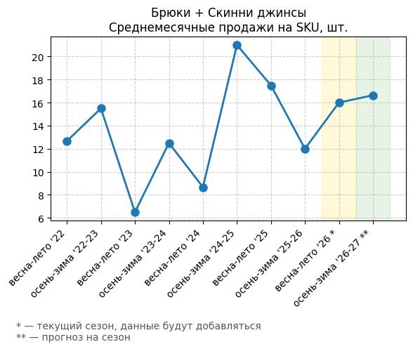 Брюки + Скинни джинсы - Среднемесячные продажи на SKU, шт.