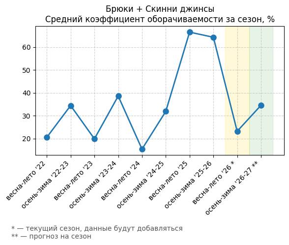 Брюки + Скинни джинсы - Средний коэффициент оборачиваемости за сезон, %