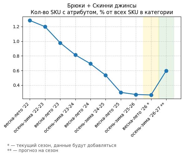 Брюки + Скинни джинсы - Кол-во SKU с атрибутом, % от всех SKU в категории