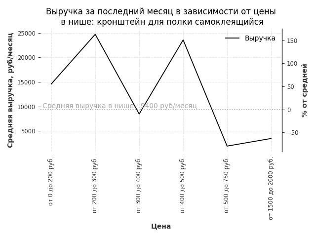 Средняя выручка в нише - 18500 руб./месяц. Максимальная выручка 188400 руб./месяц, на 920% больше среднего в нише, была при цене от 10000 до 12500 руб. руб.
