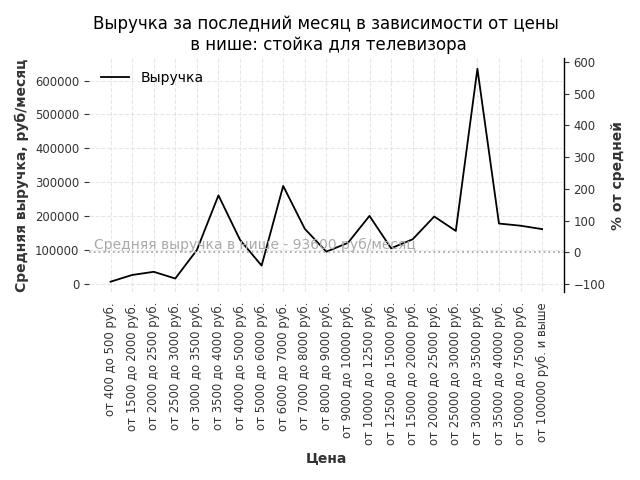 Средняя выручка в нише - 93600 руб./месяц. Максимальная выручка 634700 руб./месяц, на 580% больше среднего в нише, была при цене от 30000 до 35000 руб. руб.