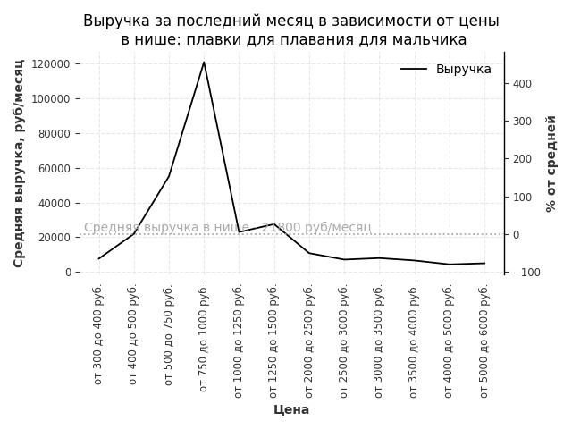 Средняя выручка в нише - 12200 руб./месяц. Максимальная выручка 69600 руб./месяц, на 470% больше среднего в нише, была при цене от 2000 до 2500 руб. руб.