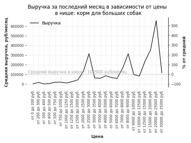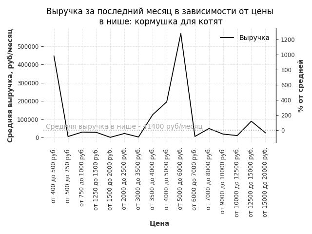 Средняя выручка в нише - 100900 руб./месяц. Максимальная выручка 656900 руб./месяц, на 550% больше среднего в нише, была при цене от 20000 до 25000 руб. руб.
