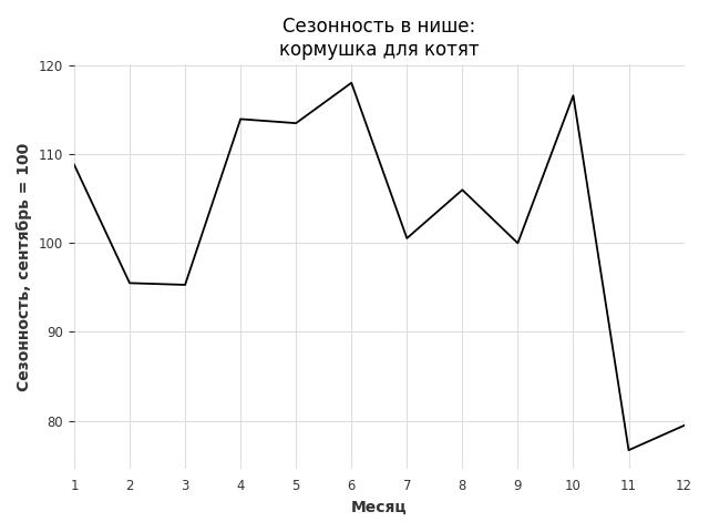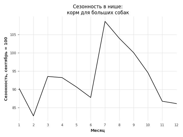 Сезонность в нише слабая. Пик сезонных продаж в нише - июль. В ближайшие месяцы можно ожидать сезонного спада продаж до 14%.
