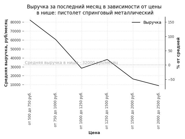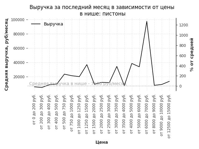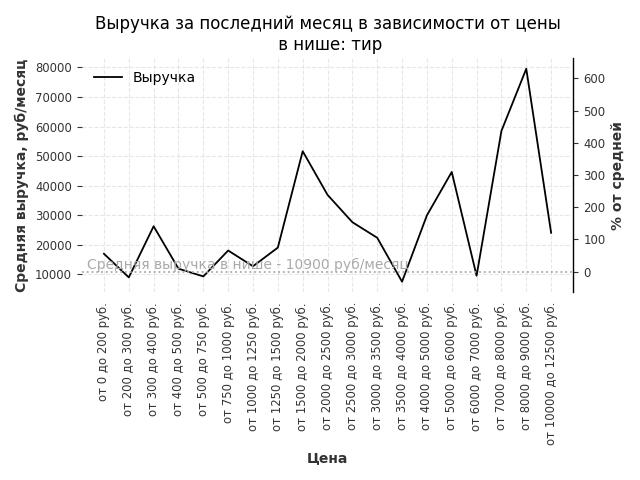 Средняя выручка в нише - 10900 руб./месяц. Максимальная выручка 79500 руб./месяц, на 630% больше среднего в нише, была при цене от 8000 до 9000 руб. руб.