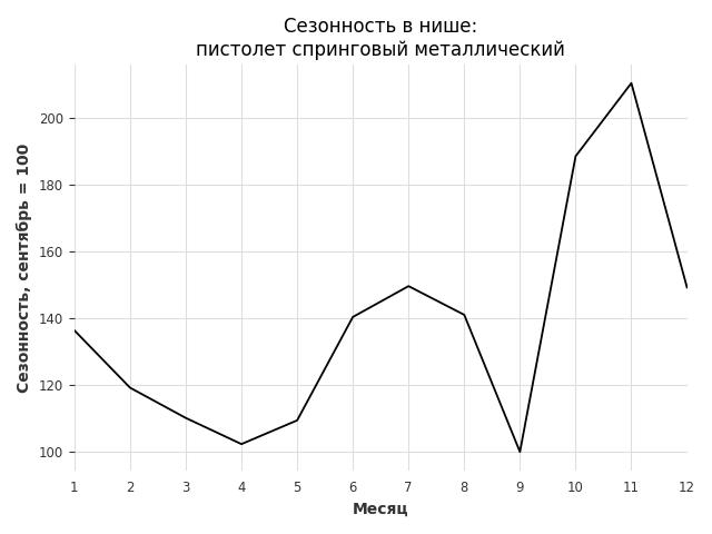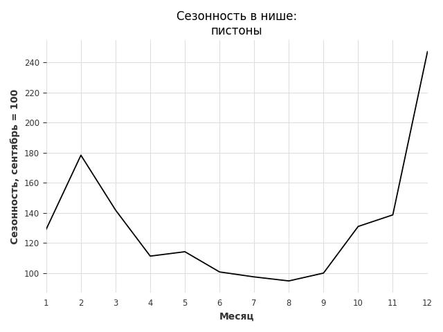 Сезонность в нише средняя. Пик сезонных продаж в нише - ноябрь. В ближайшие месяцы можно ожидать сезонного роста продаж до 110%.