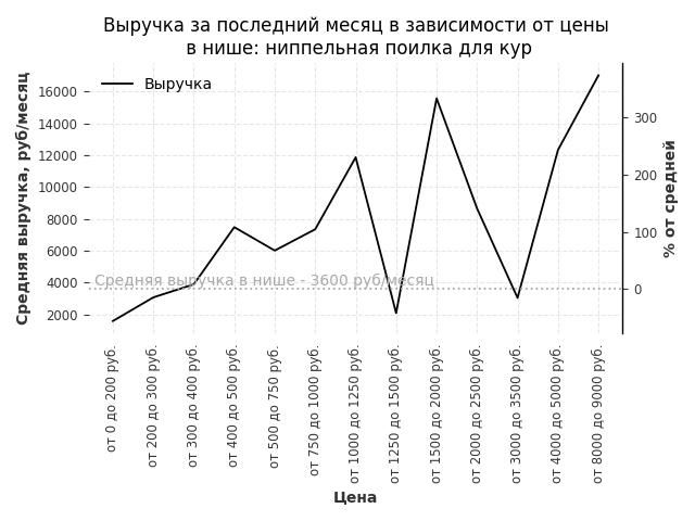 Средняя выручка в нише - 3600 руб./месяц. Максимальная выручка 17000 руб./месяц, на 370% больше среднего в нише, была при цене от 8000 до 9000 руб. руб.