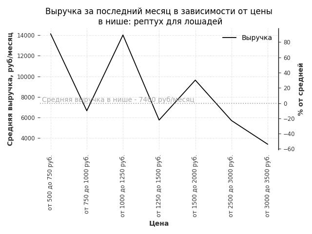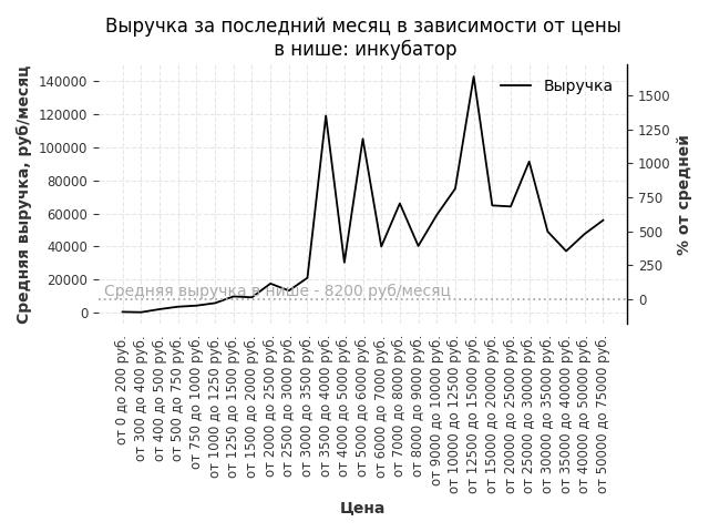 Средняя выручка в нише - 8200 руб./месяц. Максимальная выручка 142600 руб./месяц, на 1640% больше среднего в нише, была при цене от 12500 до 15000 руб. руб.