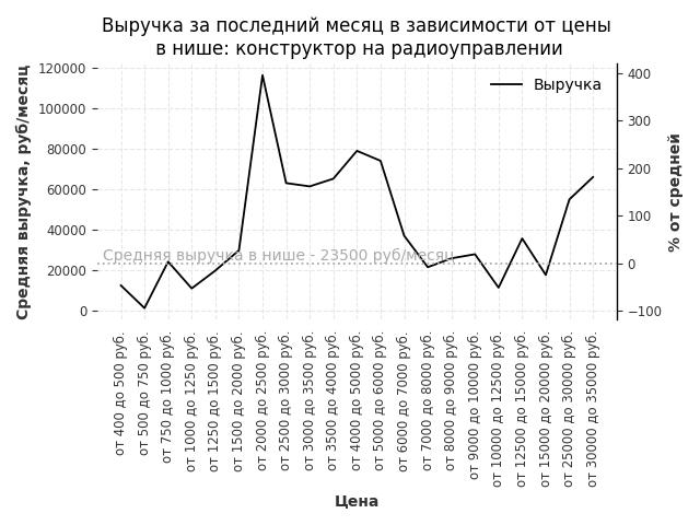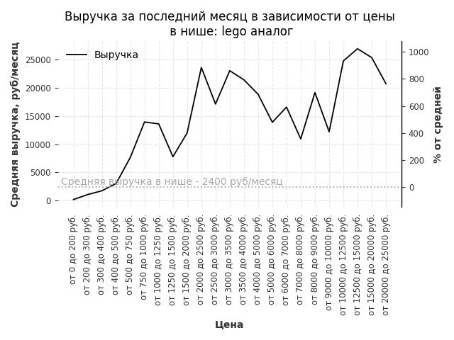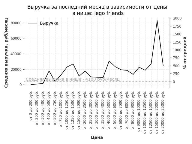 Средняя выручка в нише - 23500 руб./месяц. Максимальная выручка 116500 руб./месяц, на 400% больше среднего в нише, была при цене от 2000 до 2500 руб. руб.