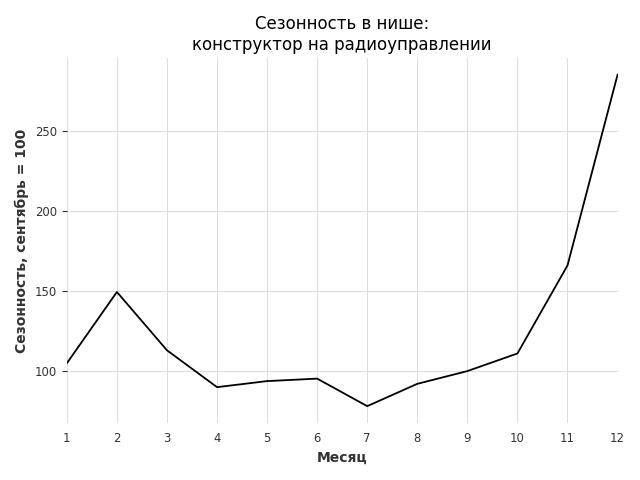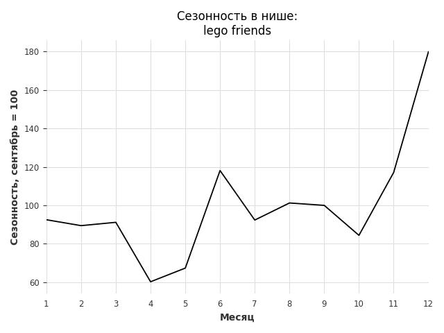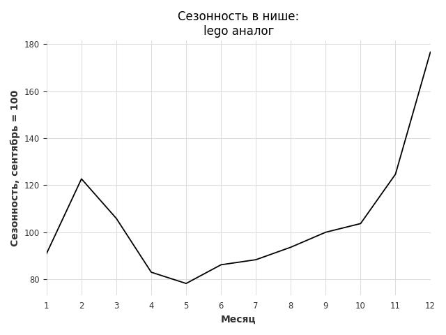 Сезонность в нише сильная. Пик сезонных продаж в нише - декабрь. В ближайшие месяцы можно ожидать сезонного роста продаж до 184%.