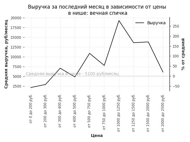Средняя выручка в нише - 5100 руб./месяц. Максимальная выручка 19300 руб./месяц, на 280% больше среднего в нише, была при цене от 1000 до 1250 руб. руб.