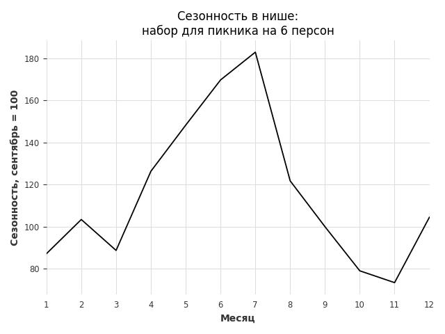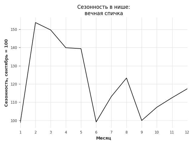Сезонность в нише слабая. Пик сезонных продаж в нише - февраль. В ближайшие месяцы можно ожидать сезонного роста продаж до 17%.