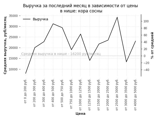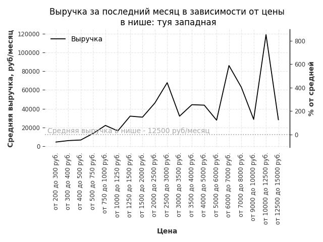 Средняя выручка в нише - 12500 руб./месяц. Максимальная выручка 119000 руб./месяц, на 850% больше среднего в нише, была при цене от 10000 до 12500 руб. руб.