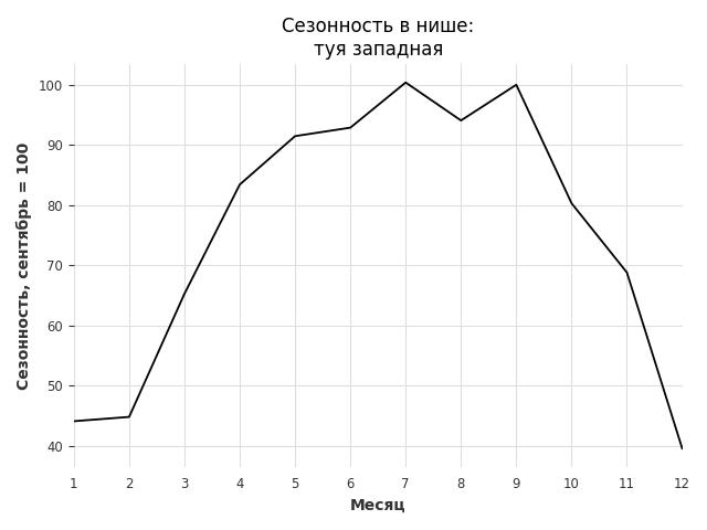 Сезонность в нише средняя. Пик сезонных продаж в нише - июль. В ближайшие месяцы можно ожидать сезонного спада продаж до 61%.