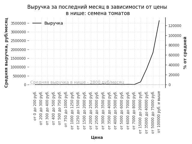 Средняя выручка в нише - 2800 руб./месяц. Максимальная выручка 3636700 руб./месяц, на 129780% больше среднего в нише, была при цене от 100000 руб. и выше руб.