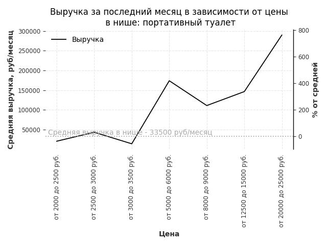 Средняя выручка в нише - 33500 руб./месяц. Максимальная выручка 289500 руб./месяц, на 760% больше среднего в нише, была при цене от 20000 до 25000 руб. руб.