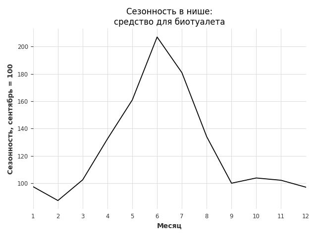Сезонность в нише средняя. Пик сезонных продаж в нише - июнь. В ближайшие месяцы сезонность не будет заметно влиять на продажи.