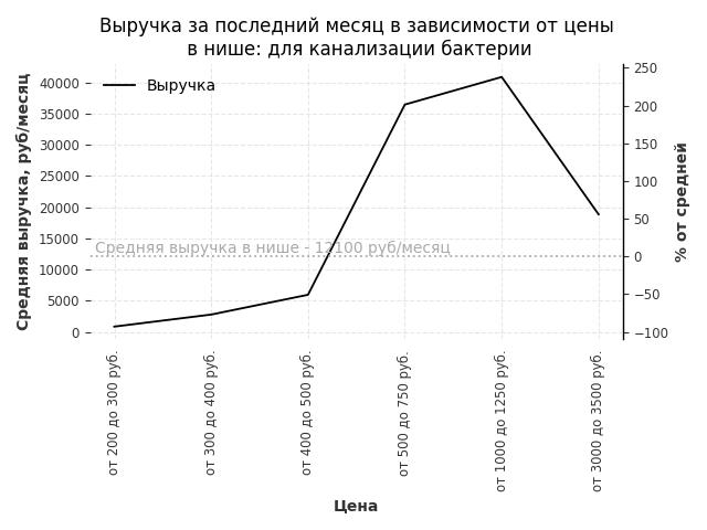 Средняя выручка в нише - 12100 руб./месяц. Максимальная выручка 40900 руб./месяц, на 240% больше среднего в нише, была при цене от 1000 до 1250 руб. руб.