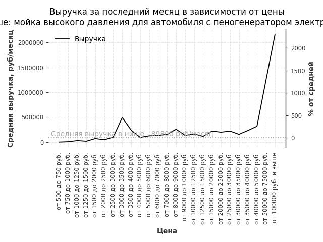 Средняя выручка в нише - 160500 руб./месяц. Максимальная выручка 676600 руб./месяц, на 320% больше среднего в нише, была при цене от 3500 до 4000 руб. руб.
