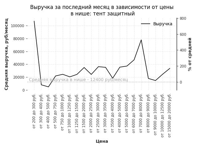 Средняя выручка в нише - 12400 руб./месяц. Максимальная выручка 106800 руб./месяц, на 760% больше среднего в нише, была при цене от 200 до 300 руб. руб.