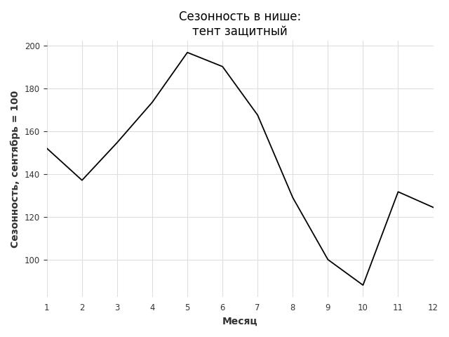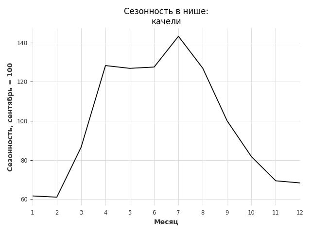 Сезонность в нише сильная. Пик сезонных продаж в нише - июнь. В ближайшие месяцы можно ожидать сезонного спада продаж до 39%.